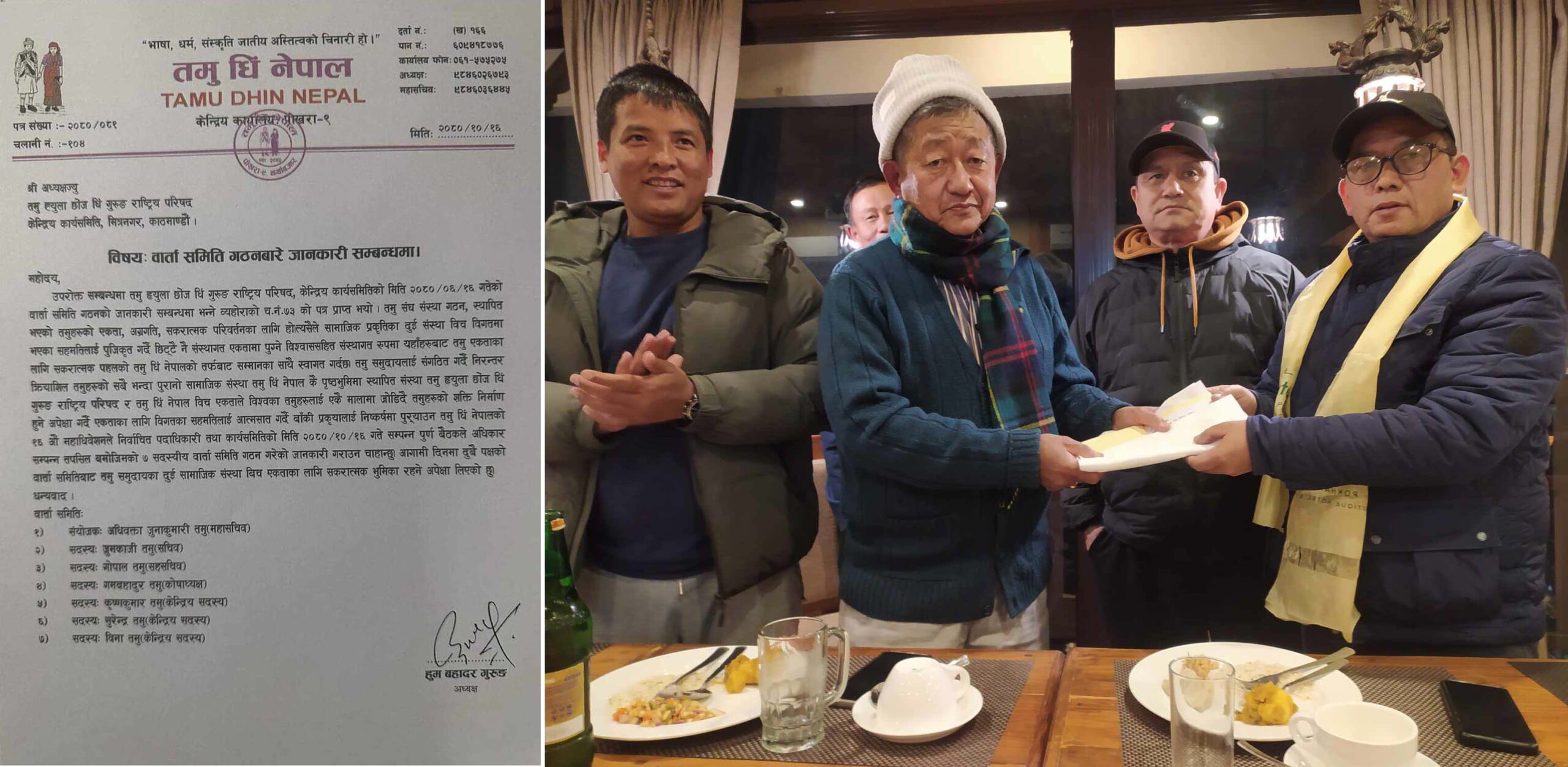 तमु धिं नेपालको नवनिर्वाचित कार्यसमितिको माघ १६ गते सम्पन्न बैठकले महासचिव अधिवक्ता जुनाकुमारी गुरुङको संयोजकत्वमा गठित ७ सदस्यीय वार्ता समिती गठनको जानाकारीसहित तमु धिंका अध्यक्ष हुमबहदुर तमूले तमू ह्युल छोंज धिंका अध्यक्ष कर्णबहादुर गुरुङलाई पत्र हस्तान्तरण गरेको हो ।