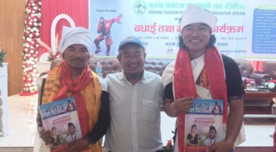पोखरा । गुरूङ पर्यटन व्यवसायी संघ नेपाल (जिटिन) गण्डकीको आयोजनामा हिमाल आरोही तेजन गुरूङलाई सम्मान गरिएको छ । तेजनले ९ अक्टोबर २०२४ मा नेपाली समयअनुसार बिहान ५ बजे चीनको आठ हजार २७ मिटर अग्लो शीशापाङ्मा हिमाल आरोहण गरेका थिए। योसँगै उनले विश्वका आठ हजार मिटरभन्दा बढी उचाइ भएका १४ वटा हिमालको सफल आरोहण गरेका छन्।