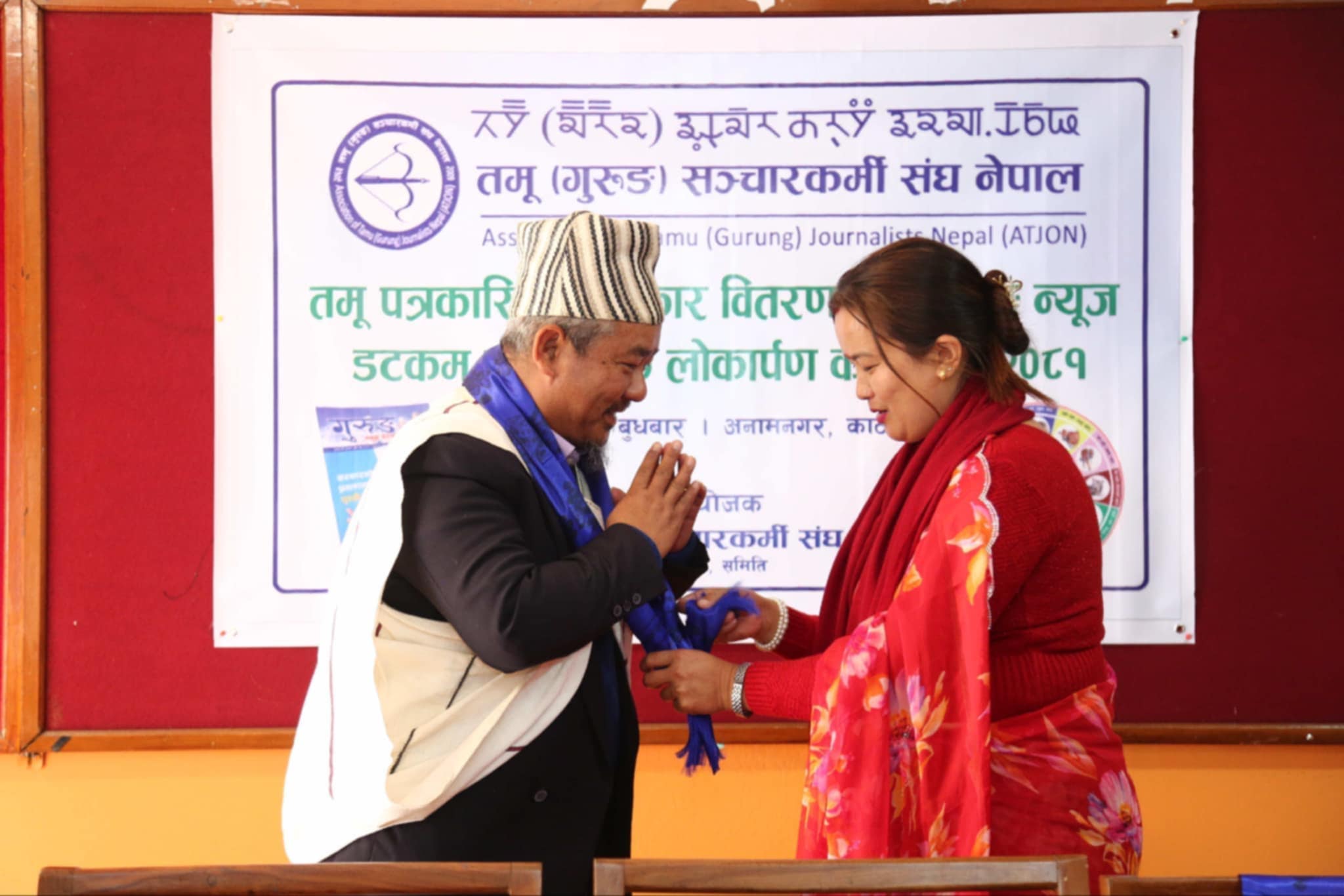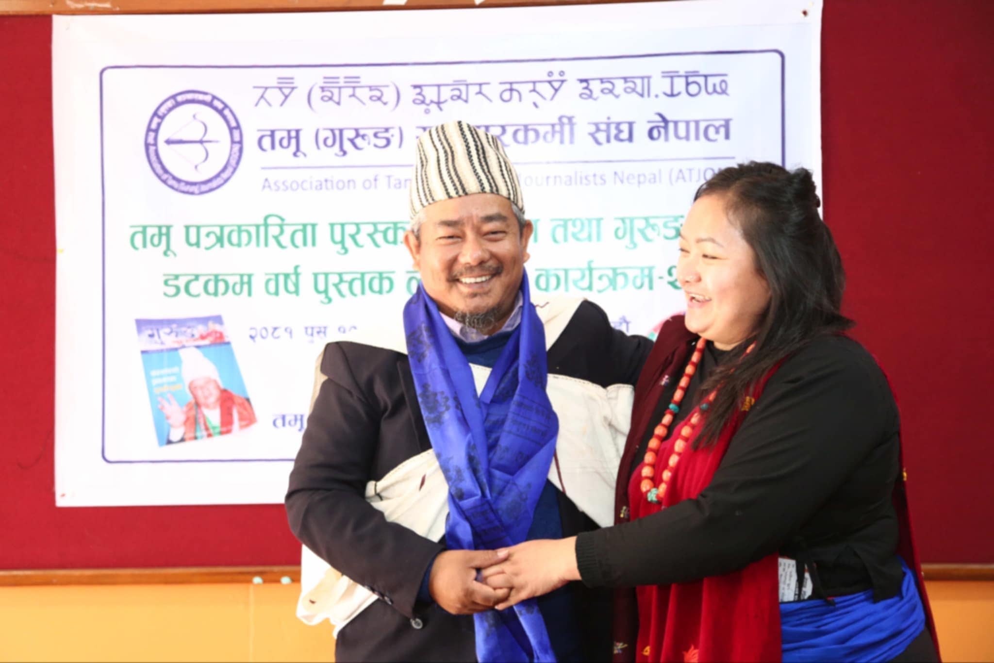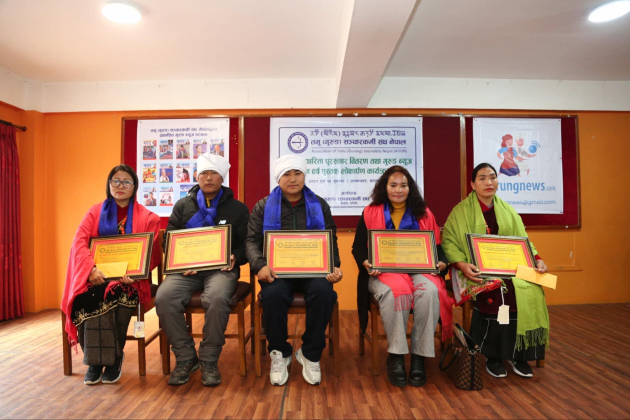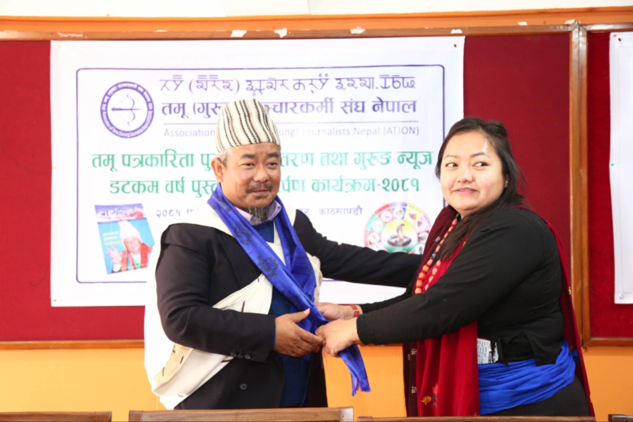 बुधबार नेपाल सरकारका प्रवक्ता एवम् सूचना सञ्चार तथा प्रविधिमन्त्री पृथ्वीसुब्बा गुरूङमार्फत गुरूङ जातिको पहिचानसहि फेटा लगाएर नगद र सम्मानपत्रसहित पुरस्कृत गरिएको आयोजक संस्था तमू (गुरूङ) सञ्चारकर्मी संघ नेपाल केन्द्रीय समितिका अध्यक्ष लाला गुरूङले जानकारी दिनुभयो।