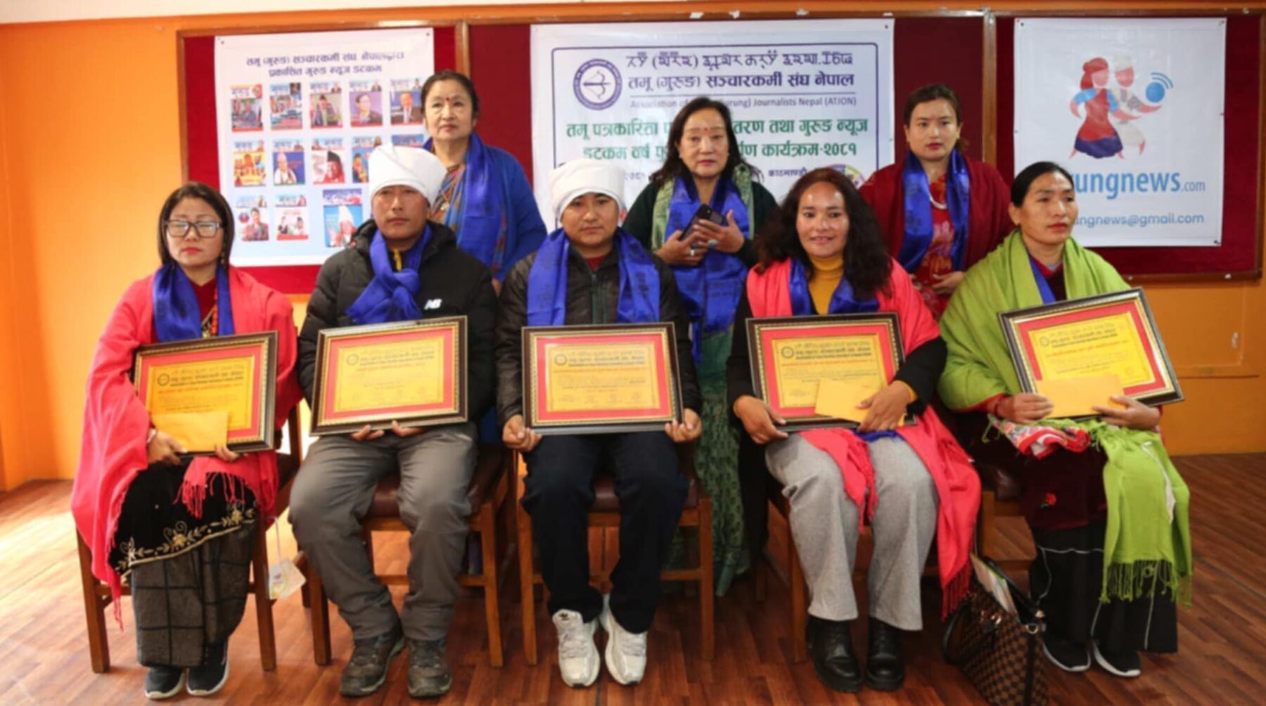 दि काठमान्डु पोष्टकी सम्वाददाता अपेक्षा गुरूङलाई ‘सुश्री भद्रकुमारी घले पत्रकारिता प्रोत्साहन पुरस्कार’, राज्य टेलिभिजनकी समाचार वाचक एवम् कार्यक्रम प्रस्तोता निरू गुरूङलाई ‘तमू ल्होसार मूल आयोजक पत्रकारिता पुरस्कार’, रेडियो नेपाल गण्डकी प्रादेशिक प्रसारण केन्द्रकी तमू भाषा समाचार वाचक, समाचार सम्पादक एवम् कार्यक्रम उत्पादक शीला गुरूङलाई ‘आदिकवि हर्कबहादुुर गुरूङ स्मृति पत्रकारिता पुरस्कार’ र म्याग्दीस्थित धौलागिरी खबरका फोटो पत्रकार गणेश गरूङ (सुरेन)लाई ‘लक्ष्मी गुरूङ पत्रकारिता पुरस्कार’ प्रदान गरिएको अध्यक्ष गुरूङले जानकारी दिए। उनीहरु सबैलाई जनही नगद दश हजार रूपैयाँ राशिको पुरस्कार प्रदान गरिएको हो।