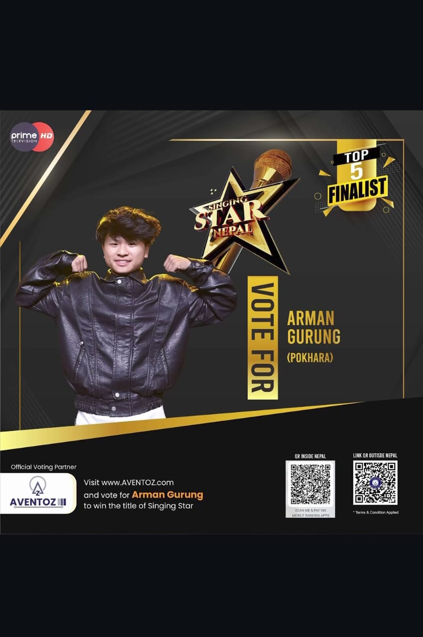 निर्णायक/जजहरुबाट समेत राम्रो प्रशंसा पाउँदै आउनुभएका अरमान गुरुङ उपाधीका लागि बलियो दाबेदार हुनुहुन्छ ।अरमानलाई भोट गर्न www.AVENTOZ.vom मा गई SINGING STARKO ब्यानरमा क्लिक गरेपछि दोश्रोमा नम्बर अरमान गुरुङ पोखरा लेखेको ब्यानर आउनेछ । सो ब्यानरबाट भोट गर्न सकिने छ । सिङ्गिङ स्टारको ग्राण्ड फिनाली जेठ ३ गते हुदैँ छ ।