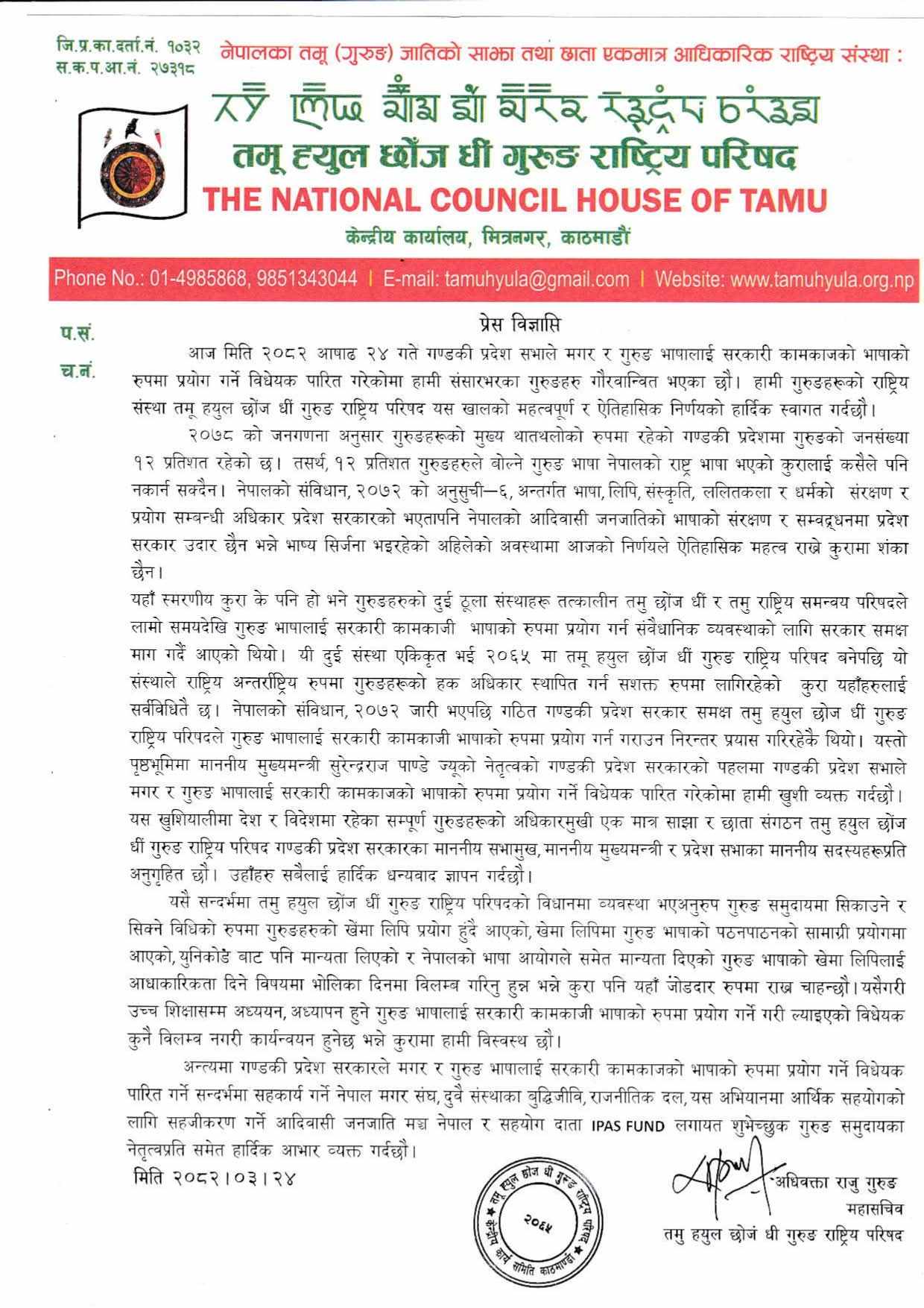 कास्की । गण्डकी प्रदेश सरकारले गुरूङ र मगर भाषालाई सरकारी कामकाजीको भाषाको रूपमा प्रयोग गर्ने विधेयक पारित गरेको भन्दै तमू ह्युल छोंज धीँ गुरूङ राष्ट्रिय परिषदले उक्त निर्णयको स्वागत गरेको छ। गण्डकी सरकारले ऐतिहासिक निर्णय गरेर नेपालको आदिवासी जनजाति समुदायको माग ढिलै भए पनि सम्बोधन गरेको ह्युल छोंज धींले जनाएको छ। तर, यो विधेयकलाई बिलम्ब नगरी यथाशीघ्र कार्यान्वयनमा ल्याउन तमू ह्युल छोंज धीँले आग्रह गरेको छ।