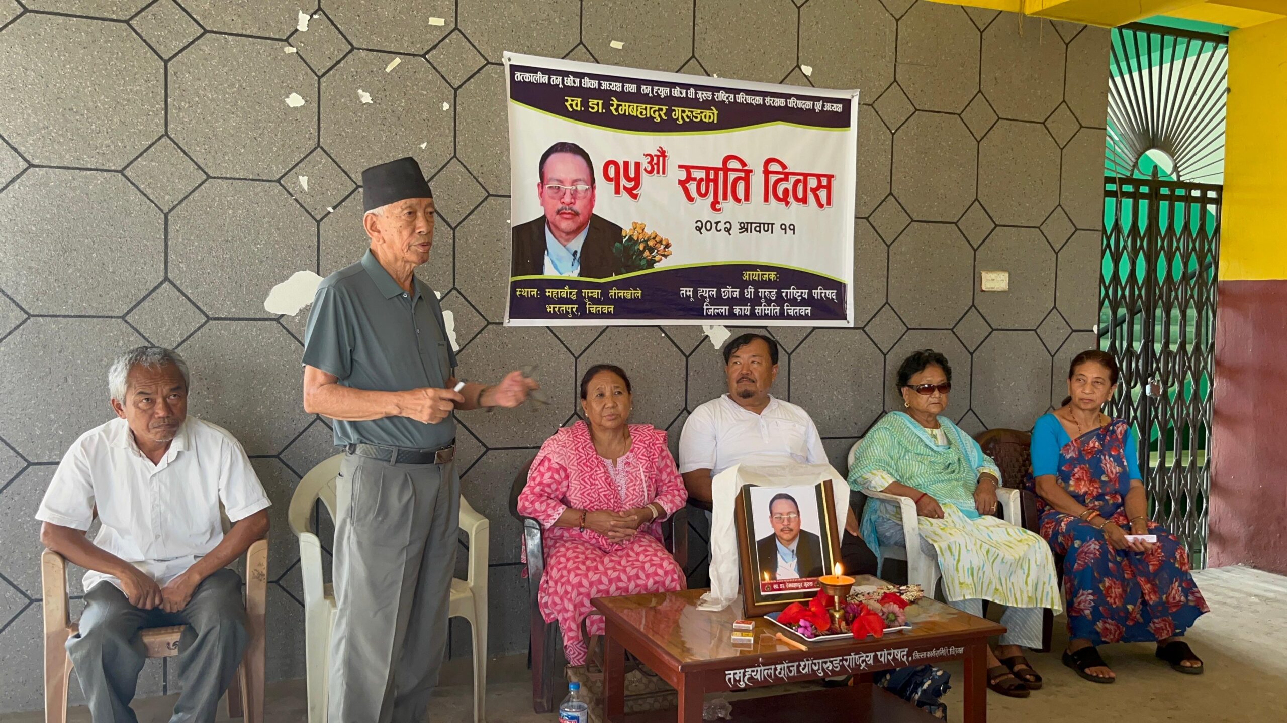 चितवन । तत्कालीन तमू छोँज धीँका अध्यक्ष एवम् तमू ह्युल छोँज धीँ गुरूङ राष्ट्रिय परिषद संरक्षक परिषदका पूर्वअध्यक्ष डा रेमबहादुर गुरूङलाई चितवनका गुरूङहरुले स्मरण गरेका छन्। डा गुरूङको १५औँ पुण्यतिथिमा चितवनका गुरूङहरुले देशभरका गुरूङहरुलाई एक ठाउँमा ल्याउने भूमिका खेलेको भन्दै चर्चा गरेका हुन्। तमू ह्युल छोँज धीँ गुरूङ राष्ट्रिय परिषद् चितवनले आयोजना गरेको स्मृति दिवसमा डा रेमको योगदानकै कारण आज गुरूङ समुदाय एकताको सूत्रमा बाँधिएको तमू समुदायका अगुवाहरुले बताए। तसर्थ डा रेमले समुदायप्रति गरेको योगदानलाई पछिल्लो समय तमू समुदायको नेतृत्व गर्नेहरुले भुल्न नहुने समेत तमू अगुवाहरुले बताए।