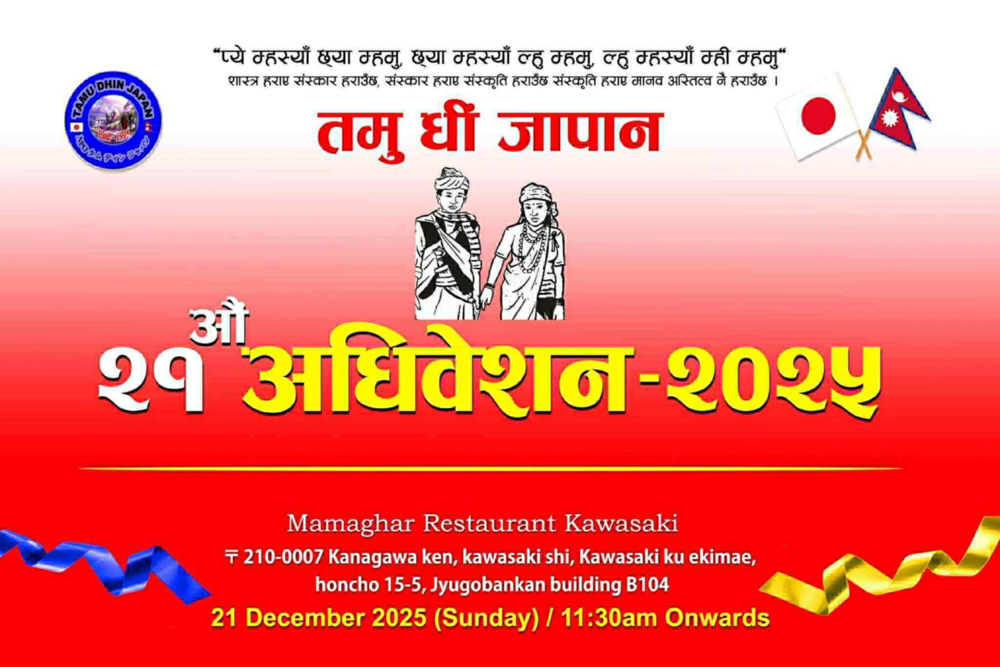 टोकियो, जापान । जापानमा रहेका गुरुङ समुदायको साझा संस्था तमू धीँ जापानले २१औँ अधिवेशन २१ डिसेम्बर २०२५ मा आयोजना गर्ने तयारी गरेको छ। गुरुङ भाषा, संस्कार, संस्कृति तथा पहिचान संरक्षणको विषयमा समेत छलफल हुने संस्थाका महासचिव विनय गुरुङले जानकारी दिए।