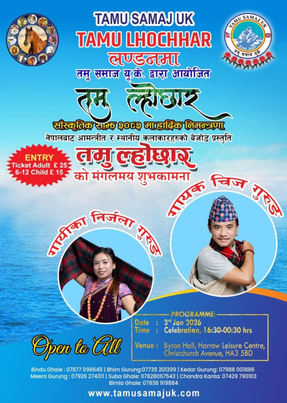 कार्यक्रम ३ जनवरी २०२६ का दिन साँझ ४:३० बजे देखि राति १२:०० बजे सम्म चल्ने महासचिव सुब घले ले जानकारी दिए ।कार्यक्रम स्थान: Byron Hall, Harrow Leisure Centre, HA3 5BD मा हुनेछ ।तमु समाज युकेले सम्पूर्ण युके मा रहनु भएका गुरुङ तथा नेपाली समुदायलाई समय मिलाई उपस्थित भइ सप्री ल्हो (सर्प वर्ग) लाई बिदाइ र त–ल्हो (घोडा वर्ग) लाई स्वागत गर्ने यस ऐतिहासिक क्षणमा सहभागी हुन अध्यक्ष श्रीमती बिन्दु कुमारी गुरुङ घलेले हार्दिक अनुरोध गरेको छ ।